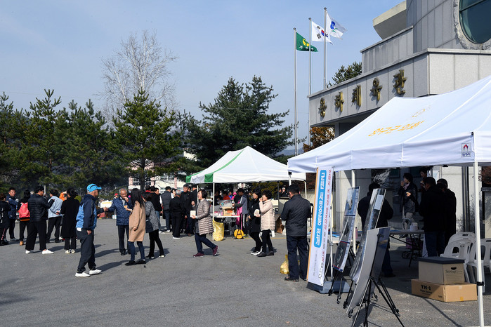[양구군=세계타임즈 김민석 기자] 김철 안대리비행장항공대대확대반대특별위원회위원장과 의회사무과 직원들이 15일 용하체육관 입구에서 안대리 비행장 항공대대 확대를 반대하는 군민 서명운동을 전개했다.