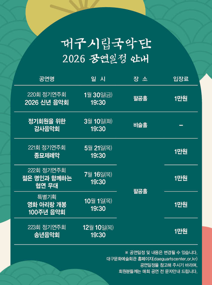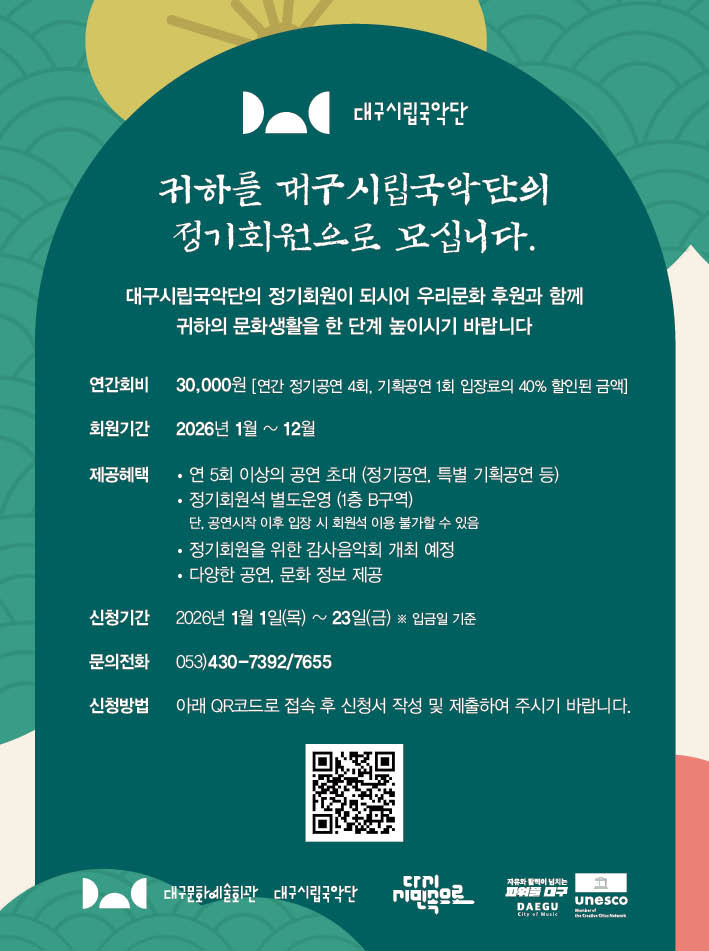 회원 모집 기간은 1월 23일(금)까지로, 대구문화예술회관 누리집 공지사항을 확인하고 가입하면 된다. (문의 : 대구시립국악단 ㅁ053-430-7392)