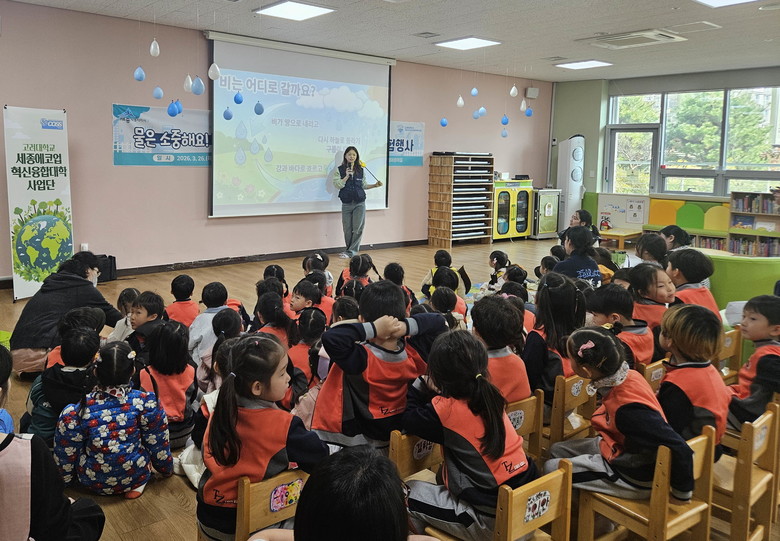 1부에서는 아이누리어린이집 원생들을 대상으로 고려대학교 세종에코업혁신융합대학사업단 서포터즈가 강사로 나서 물의 중요성과 생활 속 물 절약 실천방법, 빗물 등 재이용 사례 등을 설명했다.