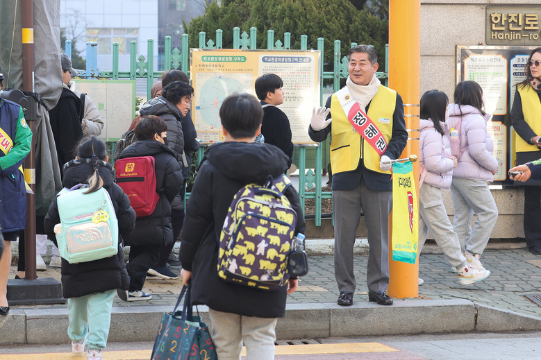 정해권 의장과 도성훈 교육감은 통학 안전 캠페인 조끼를 착용하고 학생들이 안전하게 횡단보도를 건널 수 있도록 돕는 한편, 밝은 미소와 따뜻한 인사로 아이들과 소통하며 친근한 분위기로 등굣길 캠페인을 전개했다.