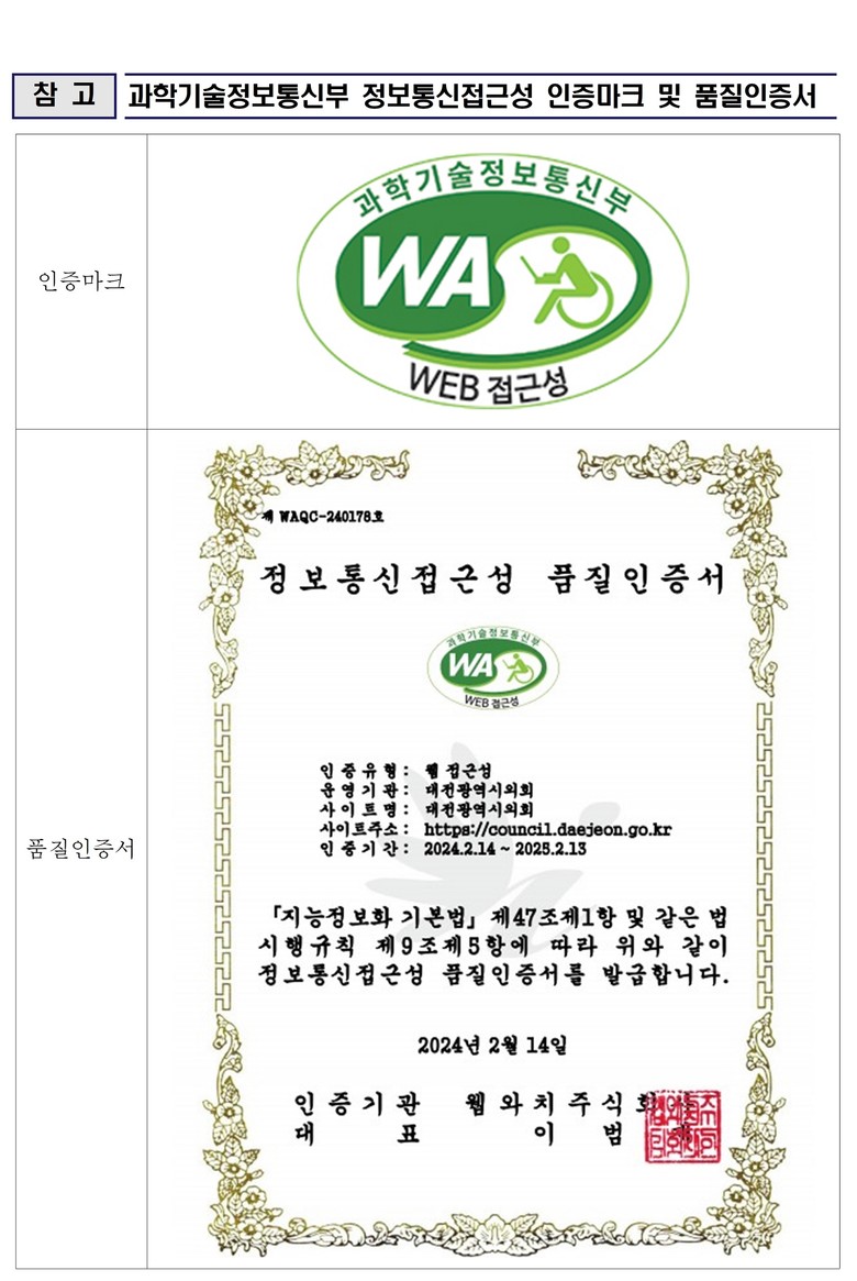 과학기술정보통신부 지정 인증기관(웹와치)이 지능정보화기본법에 따라 웹 접근성 표준지침을 준수한 누리집에 1년간 품질인증을 부여한다.