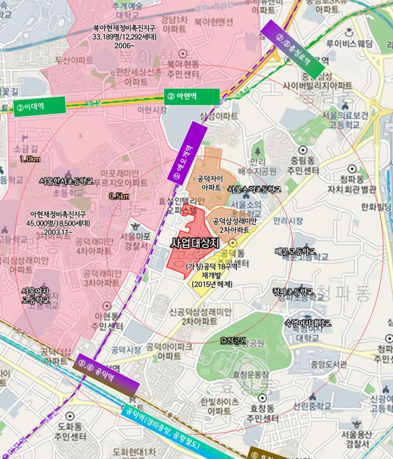 지난 2011년도에 구역 지정된 공덕1구역은 지난 2020년 도시계획위원회 심의 의견 사항을 반영하여 인접 필지 일부를 편입하고 공원 및 동주민센터 신설 등 기반시설 일부가 변경되어 구역 면적이 416㎡ 증가한다.