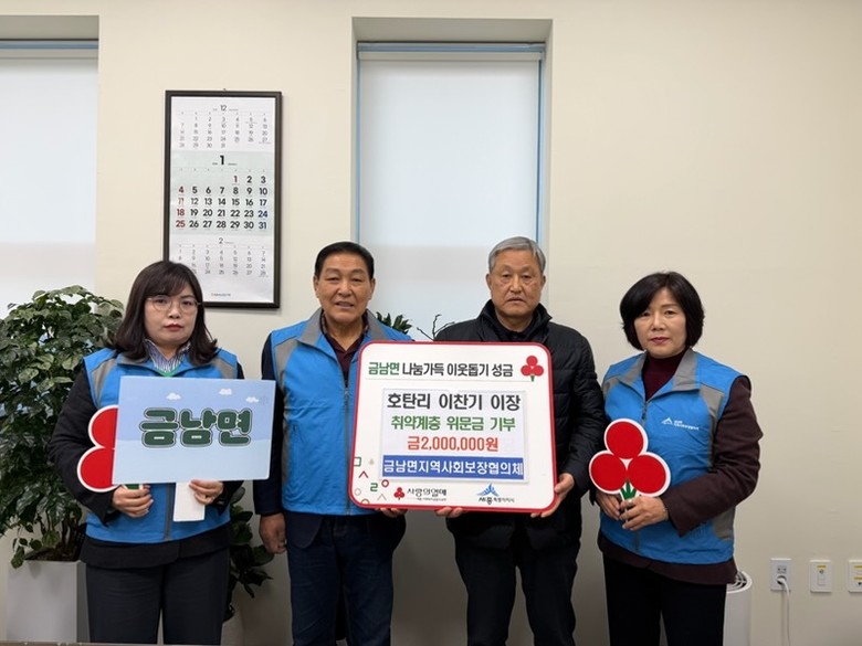이선영 금남면장은 “지역을 위해 늘 관심과 나눔을 실천해주시는 호탄리 이장님께 감사드린다”며 “기탁된 후원금은 도움이 필요한 가구에 소중히 전달하겠다”고 말했다.