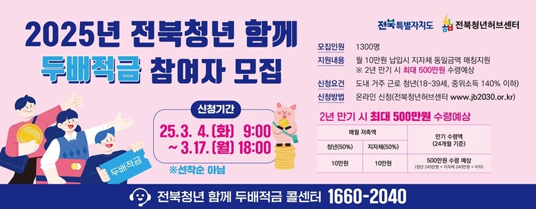 [김제 = 세계타임즈 김서주 기자] 김제시(시장 정성주)는 오는 17일까지 「2025년 전북청년 함께 두 배 적금」 참여자를 모집한다고 밝혔다.