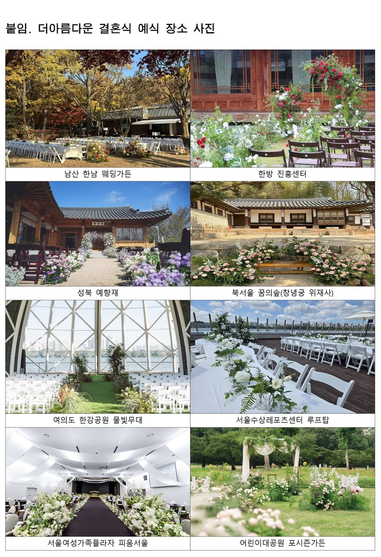 또 남산.한강 등 주요 명소 5개소(대상지 추후 선정)에 위치한 예식 장소 중 결혼식이 없는 시간대에 예비부부가 웨딩 사진을 촬영할 수 있는 장소로 제공하고, 향후 호응도에 따라 촬영 장소도 단계적으로 확대해 나간다는 계획이다.