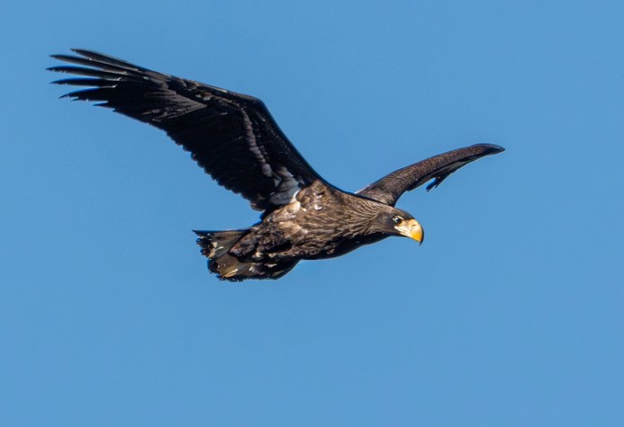 관찰된 검독수리는 날개깃 기부에 흰색 반점이 있고 꼬리가 흰색으로 확인돼 어린 새로 파악됐다.