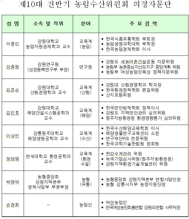 - 의정자문단은 농업, 환경, 산림, 해양수산 각 분야별 전문가로 구성하였으며, 정책개발과 대안제시 등 위원회 전문성 강화에 크게 도움이 될 것으로 보인다.