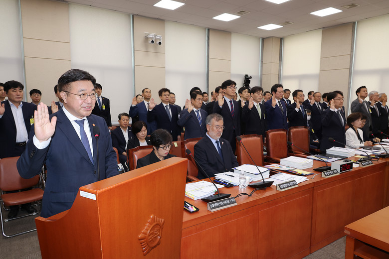윤호중 행정안전부 장관이 14일 서울 여의도 국회에서 열린 행정안전부 등에 대한 행정안전위원회 국정감사에서 선서하고 있다. 2025.10.14