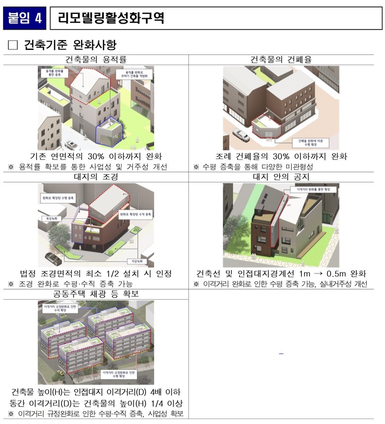‘리모델링활성화구역’은 기존 연면적의 30% 이하까지 증축을 허용하고, 건폐율도 조례 기준의 30% 이하까지 완화한다. 조경면적은 법정 기준의 절반만 설치해도 인정된다.