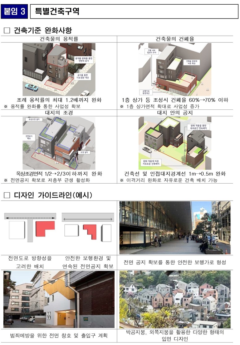 ‘특별건축구역’은 용적률을 조례 기준 최대 1.2배까지 완화하고, 1층 상가 조성 시 건폐율을 60%에서 70%로 상향한다. 대지 안 공지는 1m에서 0.5m로 완화해 좁은 필지에서도 건축이 가능하도록 했다.