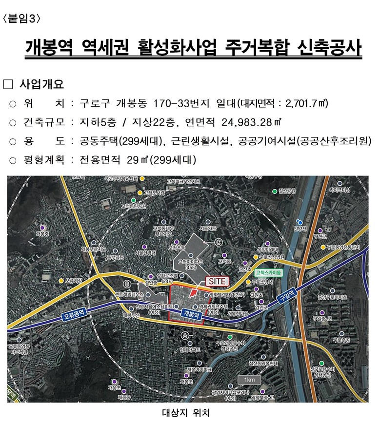 공공산후조리원과 근린생활시설은 역세권 내 부족한 생활SOC 기능을 보완하고, 지역주민의 일상 편의성과 접근성을 향상시킬 것으로 기대된다. 개봉역과 경인로를 잇는 지역 활력 거점이자 청년 주거안정과 저출산 지원시설로 집중 조성된다.