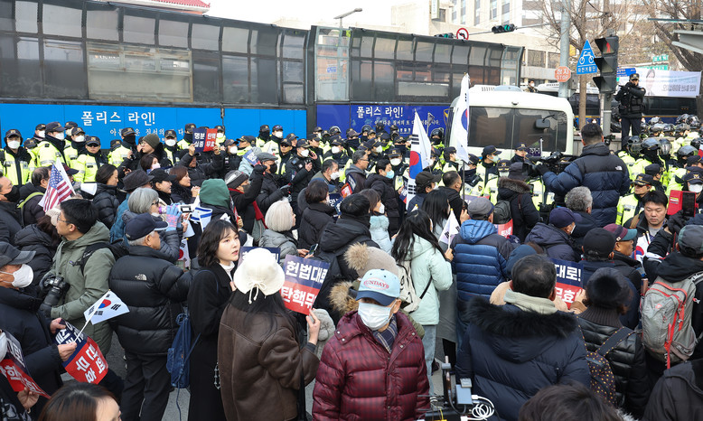 동원된 경찰버스는 192대다. 헌재 주변엔 차벽이 겹겹이 쳐졌다. 헌재 방면 시야를 가리기 위해 높이 4m가량의 폴리스라인도 설치됐다.일부 윤 대통령 지지자는 이 모습을 보고 "대통령님 못 보게 하려고 차벽을 쳤다", "부정선거 척결하라"며 욕설을 퍼부었다.한 중년 여성은 오후 1시 30분께 안국역 2번 출구 인근에서 경찰 저지를 뚫으려다 경찰관을 폭행해 연행되기도 했다. 태극기와 성조기를 든 지지자들은 "평화 시위하는 사람을 왜 데려가느냐"고 반발했다.