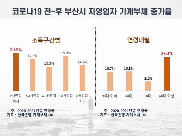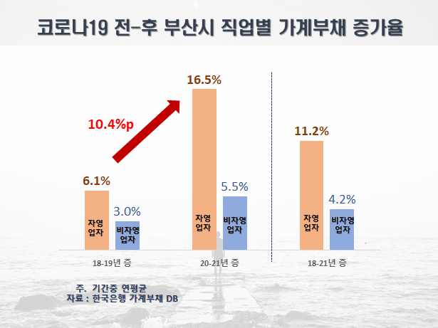 또한, 자영업자의 가계부채는 10.4%(6.1→16.5)증가로 비자영업자 2.5%(3.0→5.5)에 비해 급증했고 특히 연소득 2천만원 이하 저소득층은 20.9%, 고령층 자영업자는 29.3%로 대출이 급증하였음을 확인했다.