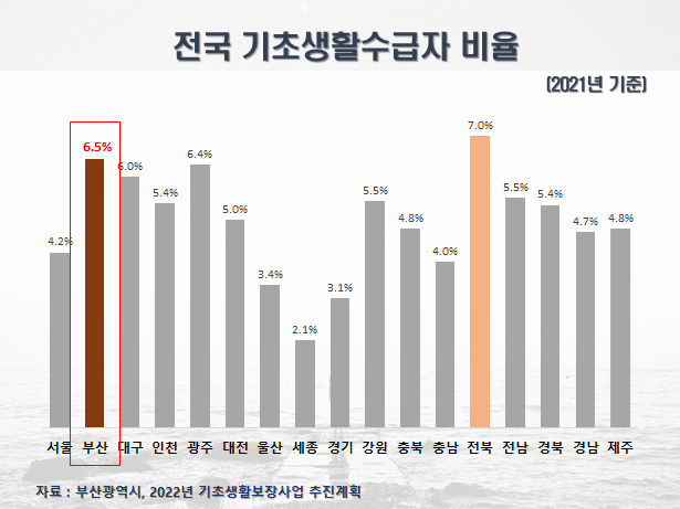 2021년 말 기준 부산시 기초생활수급자 수는 217,335명으로 인구수 대비 수급자 비율은 6.48%로 전국에서 2번째로 높다.