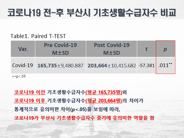 특히 김태효 의원은 부산시의회 입법정책담당관과 코로나19 이전과 이후의 부산시 기초생활수급자 수 증가(코로나19 이전 평균 165,735명, 코로나19 이후 평균 203,664명)를 대응표본 T 방식으로 분석한 결과 코로나19가 부산시 기초생활수급자 수 증가에 영향을 미쳤다는 결과를 도출했다.