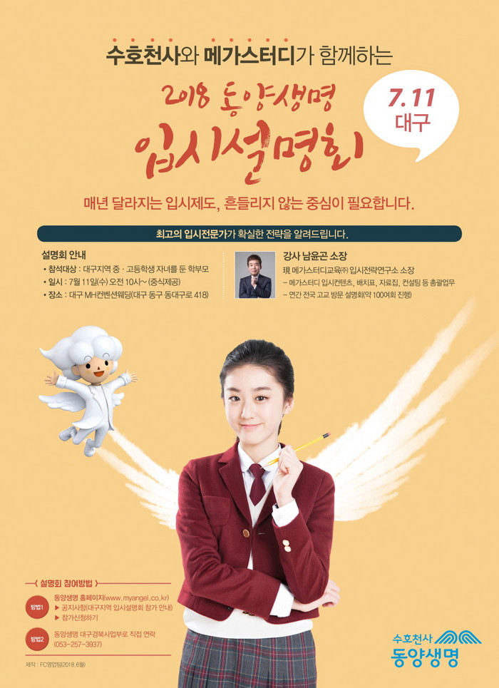 신청은 동양생명 대구경북사업부로 직접 연락하거나, 동양생명 모바일 홈페이지를 통해 사전 신청할 수 있으며, 강연과 중식이 무료로 제공된다. 또, 동양생명 고객이거나 담당설계사의 추천을 받을 경우 ‘수호천사 대학입시설명회’ 참가 확률이 높아진다.