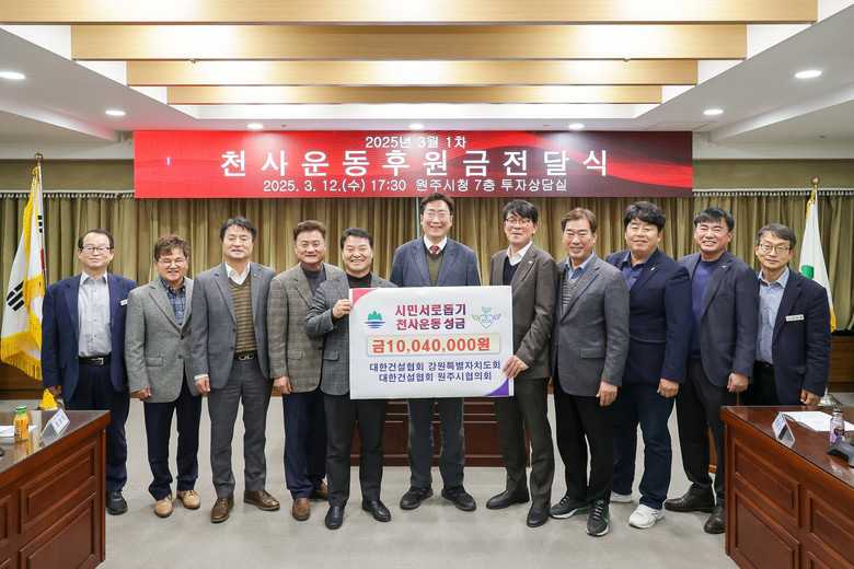 [원주시 세계타임즈=김민석 기자] 대한건설협회 강원특별자치도회 및 원주시협의회는 지난 12일 원주시청 7층 투자상담실에서 천사운동 후원금으로 각 502만 원씩 총 1,004만 원을 기탁했다.