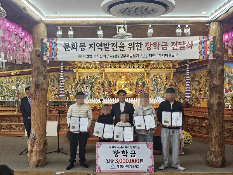 [세계타임즈=중구 이채봉 기자] 대전 중구 문화1동(동장 유영단)은 지난 26일 자연암(주지 법륜)과 MG대전남부새마을금고(이사장 조민호)에서 관내 초·중학생 20명에게 총 600만 원의 장학금을 전달했다고 밝혔다.
