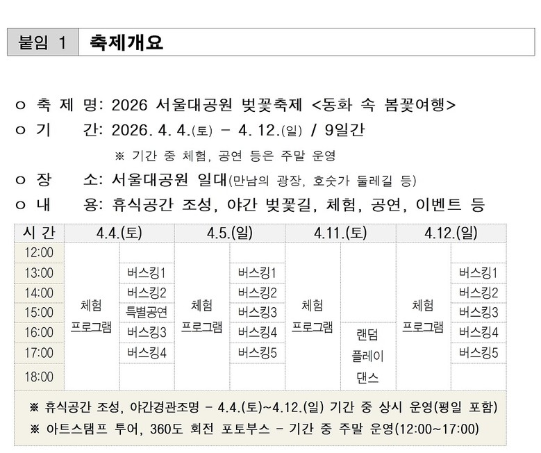 박진순 서울대공원장은 “올해 봄꽃축제는 시민들이 천천히, 더 오랫동안 봄을 즐기실 수 있도록 기간을 연장하고 풍성한 프로그램을 준비했다”며, 낮의 여유와 밤의 낭만이 가득한 서울대공원에서 소중한 분들과 잊지 못할 봄의 추억을 만드시길 바란다”고 전했다.