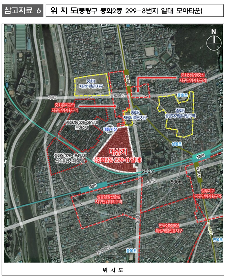 중랑구 중화2동 299-8번지 일대 모아타운은 현재 공사 중인 가로주택정비사업 1개소와 모아주택 3개소 추진을 통해 총 1,800세대(임대 286세대 포함)를 공급한다.