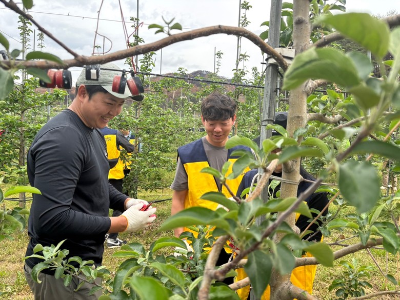 청년농업인들은 적기작업이 시급한 사과와 복숭아 과수원(총 5.2ha)에서 불필요한 열매를 솎아내는 적과작업을 실시해 농가에 실질적인 도움을 줬다.