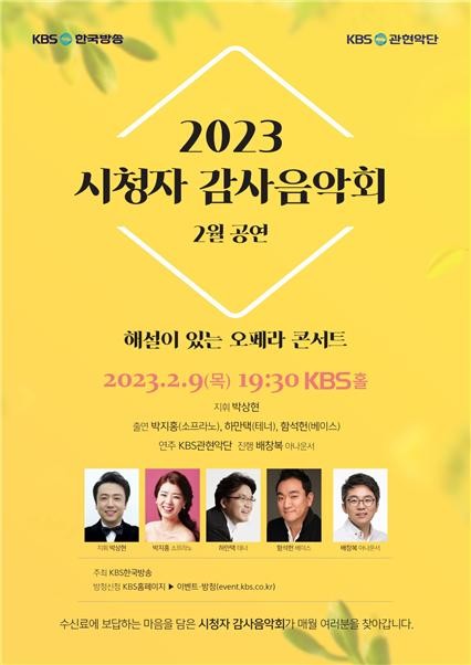 2023년에 처음으로 선보이는 2월의 음악회에서는 KBS관현악단 단장 박상현이 지휘를 맡고, 소프라노 박지홍, 테너 하만택, 그리고 베이스 함석헌이 협연자로 나선다.