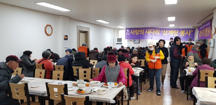 이날 삼계탕 봉사는 오전 9시부터 유희자 단장을 비롯해서 회원25명이 삼계탕 닭죽 묵무침 부침개를 만들어서 150명의 어르신들에게 점심식사를 대접하였다.