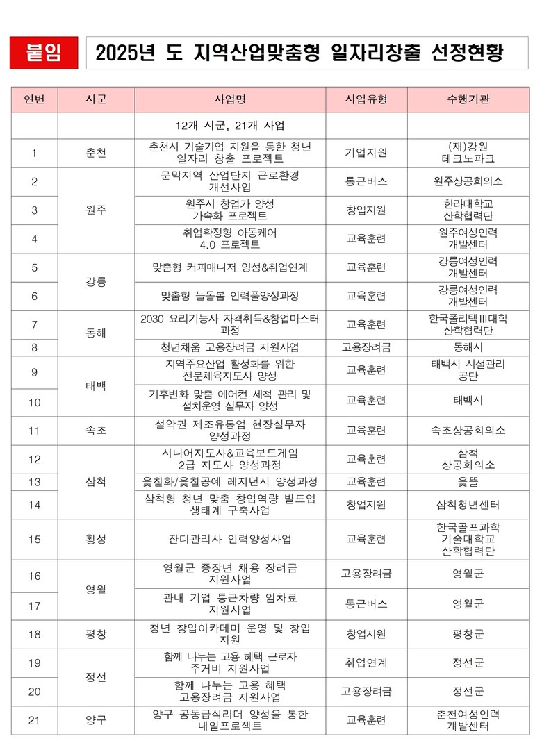 이 밖에도 청년 일자리 창출을 위한 동해시 ‘2030 요리기능사 자격취득 창업마스터 과정’, 평창군 ‘청년 창업아카데미 운영 및 창업지원교육’이 포함되었으며, 중장년층 대상으로 한 영월군 ‘채용 장려금 사업’ 등 연령대별 맞춤 사업이 진행될 예정이다.