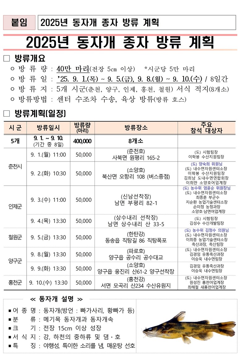 - 급격한 자원고갈 적극 대응, 내수면 생태계 보호와 수산자원 회복 총력 [강원도 세계타임즈=김민석 기자] 강원특별자치도(도지사 김진태)는 도내 내수면 생태계 보호와 고갈된 토속어종 자원 회복을 위해, 민물 매운탕의 대표 어종인 동자개 치어 40만 마리를 9월 1일 춘천호를 시작으로 10일까지 춘천·인제·철원·양구·홍천 등 5개 시군 8개 서식지에 순차적으로 방류한다고 밝혔다.