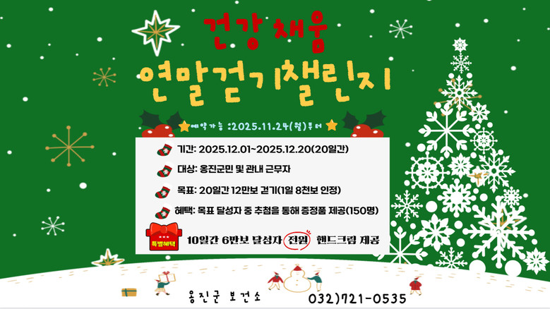12월 걷기 챌린지와 관련해 자세한 사항은 옹진군보건소 건강증진과(☎721-0535)로 문의하면 된다.