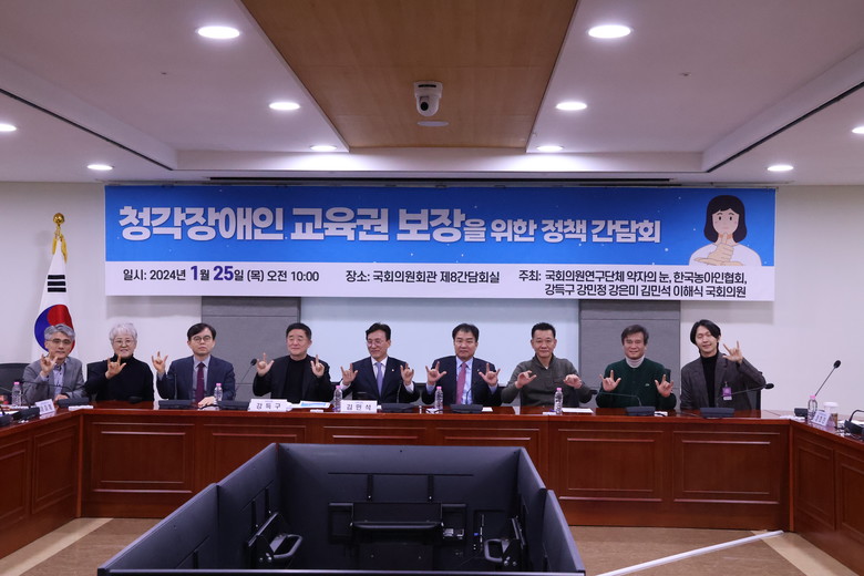 김민석 국회의원과 강득구 국회의원 , 서울수어교육원 이미혜 교수 , 교육부 진창원 특수교육정책과장 , 한국농아인협회 정희찬 상임이사 , 서울시농아인협회 허정훈 협회장 등이 참석했다 .