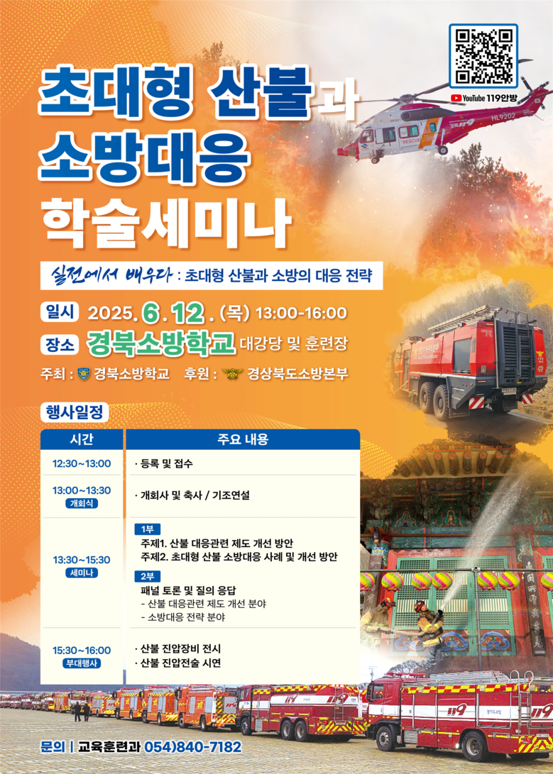 한편 이번 세미나는 소방관계자 뿐만 아니라 관심있는 누구나 참석 가능하고 당일에는 유튜브‘119안방’채널로 생중계 될 예정이다.