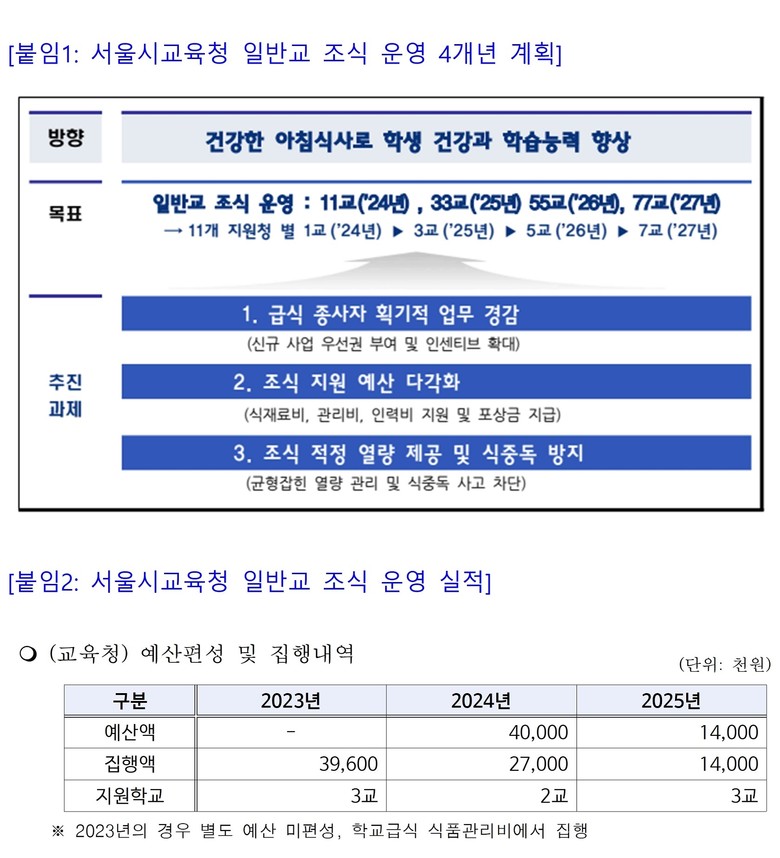 윤 의원은 “맞벌이·워킹맘 가정이 늘어난 지금, 학교에서 아이들의 아침식사를 안정적으로 지원하는 것은 학부모 부담을 덜어주는 실질적 정책"이라며 “서울의 아이들이 아침을 굶지 않고 등교할 수 있도록 조식 지원사업 예산을 반드시 원상복구해야 한다”고 촉구했다.