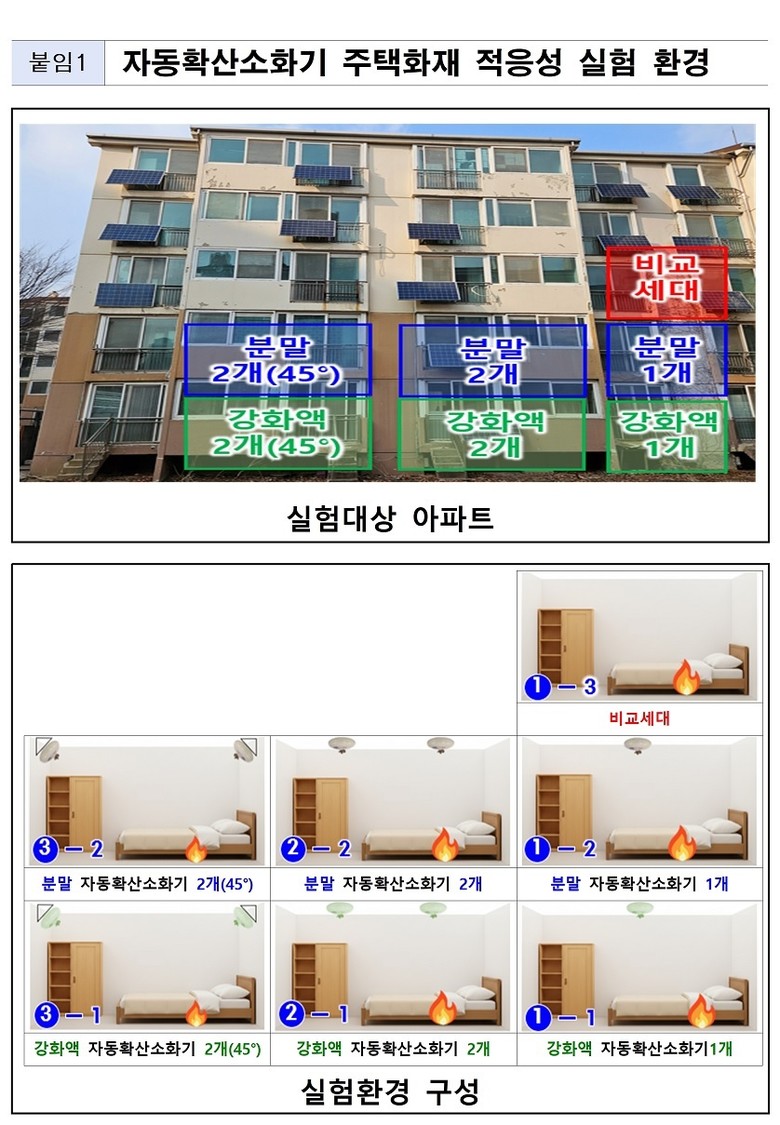 자동확산소화기의 종류, 수량 그리고 설치방법을 달리해 설치한 6개 세대와 미설치 비교세대 1개 세대에 각각 화재를 발생시켜 진압 효과를 실험한 결과, 자동확산소화기가 화재 초기(약 72℃)에 작동해 화재 확산을 효과적으로 차단함을 확인했다.