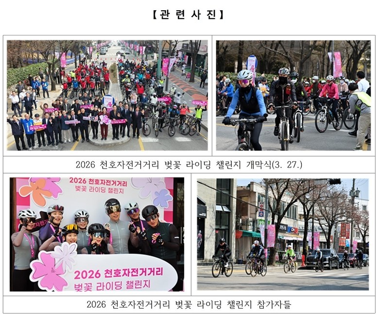 - 누적 1만 4,700여 명 참여, 상권 활성화와 민간 협력 확대 흐름 이어가 [강동구 세계타임즈=이장성 기자] 서울 강동구(구청장 이수희)는 지난 3월 27일부터 4월 2일까지, 총 7일간 열린 ‘2026 천호자전거거리 벚꽃 라이딩 챌린지’가 많은 구민과 라이더들의 참여 속 성황리에 마무리됐다고 밝혔다.