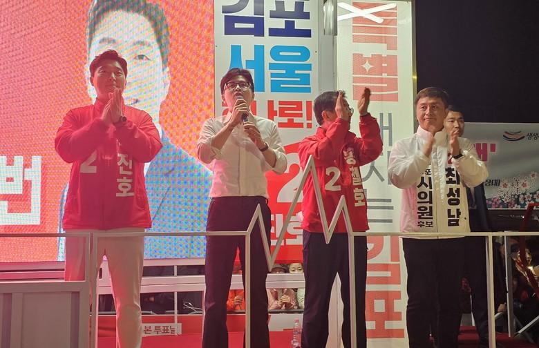 앞서 한동훈 위원장은 지난 5일 사우사거리 현장 유세를 비롯해 지난달 30일 구래역, 지난 2월3일 장기동 라베니체에서 각각 김포교체 유세를 펼쳤다.