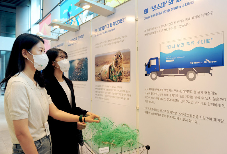이번 행사에 앞서 지난 25일부터 5일간 SK에코플랜트 수송사옥 로비에 마련된 전시 부스를 통해 임직원들이 해양폐기물 문제와 자원순환의 중요성을 담은 스토리보드를 관람하고 실제 폐어망을 재활용해 만든 의류 등의 제품들을 체험해보는 시간도 가졌다.