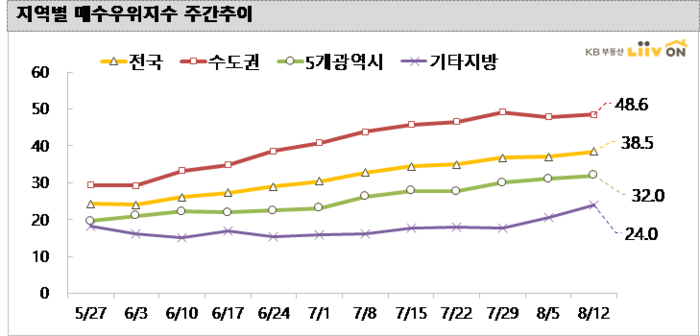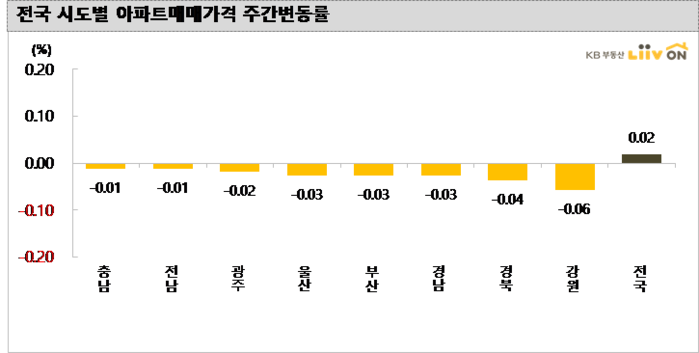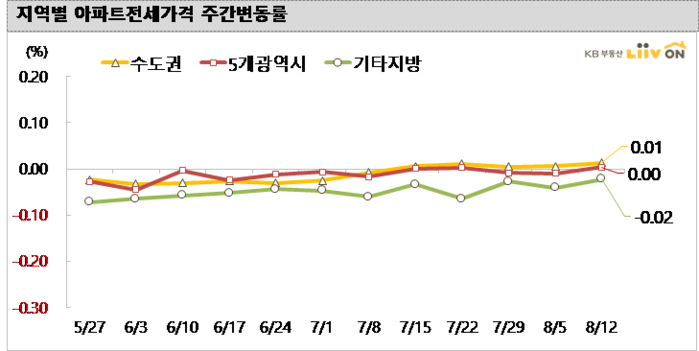 8월 12일 기준 전국 아파트 매매가격 변동률은 0.02%로 상승을 기록했다. 인천을 제외한 5개 광역시(0.01%)는 대전(0.11%), 대구(0.01%)가 상승한 반면, 울산(-0.03%)과 부산(-0.03%), 광주(-0.02%)는 하락을 보였다. 기타 지방(-0.02%)은 전주대비 하락을 기록했다.
