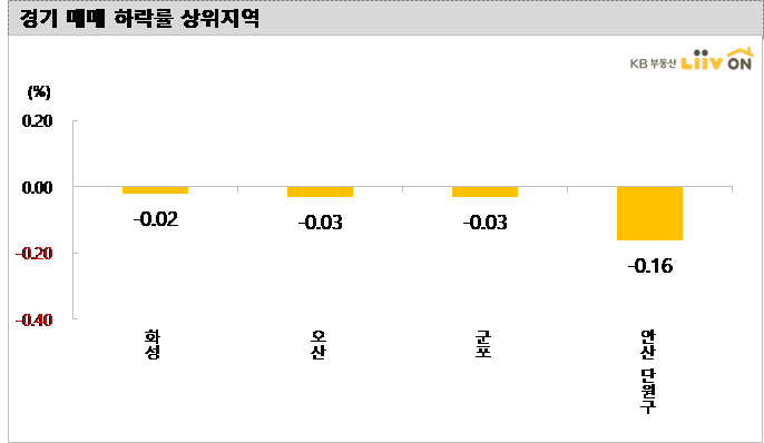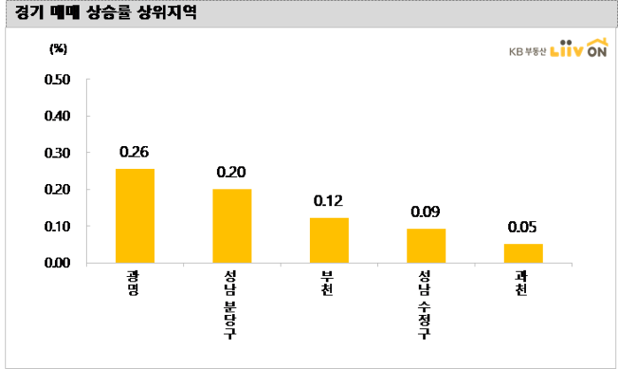 광명(0.26%), 성남 분당구(0.20%), 부천(0.12%), 성남 수정구(0.09%) 등은 상승하였고, 안산단원구(-0.16%), 군포(-0.03%), 오산(-0.03%) 등은 하락했다.