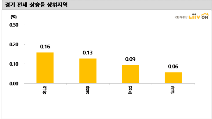 경기도 아파트 전세가격 변동률은 보합(0.00%)을 보이며 의왕(0.16%), 광명(0.13%), 김포(0.09%), 과천(0.06%) 등은 상승한 반면, 일산동구(-0.16%), 용인 기흥구(-0.10%), 수원 권선구(-0.07%), 파주(-0.06%) 등 하락했다.