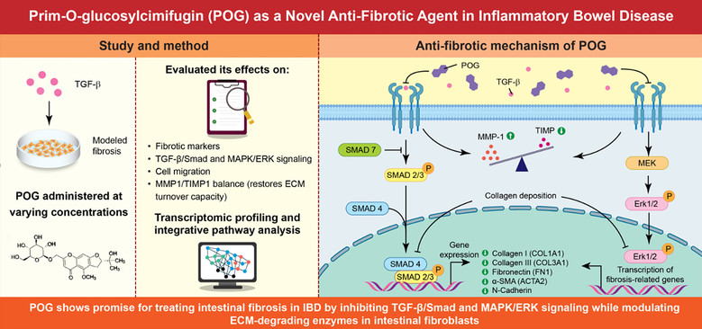 연구진들은 장 섬유화(Intestinal fibrosis) 진행을 억제하는 새로운 치료전략이자 천연물 유래 성분 ‘Prim-O-glucosylcimifugin(POG)’의 기능을 밝혀냈다.