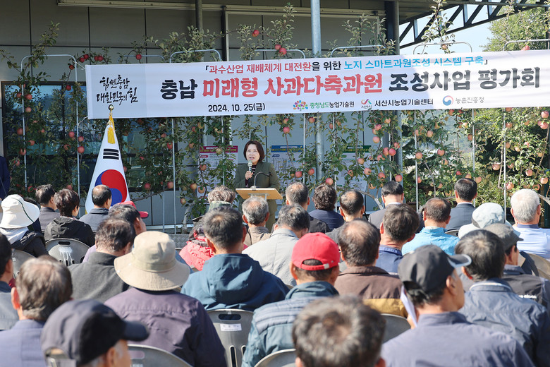 도 농업기술원은 25일 서산시 팔봉면 사과과원에서 사과 다축 재배농가와 관계 공무원 및 선도농가, 전문가 등 200여 명이 참석한 가운데, ‘충남 미래형 사과 다축과원 조성사업 평가회 및 기술연시회’를 개최했다고 밝혔다.