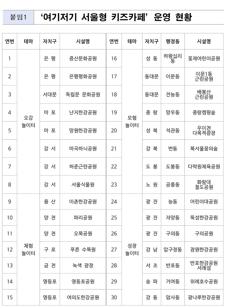 마채숙 서울시 여성가족실장은 “지난해 성황리에 운영을 마친 주말특화 여기저기 서울형 키즈카페가 올해 한층 더 매력적인 서울의 명소 30곳으로 확장되어 많은 가족들의 주말을 책임지게 되었다”라며, “특히 테마별로 특색을 갖춘 이색 놀이기구와 알찬 프로그램 운영을 통해 아이들에게 즐겁고 신나는 놀이경험을 제공하고, 양육자들에게는 아이 키우기 좋은 환경을 만들어 드리게 될 것”이라고 덧붙였다.