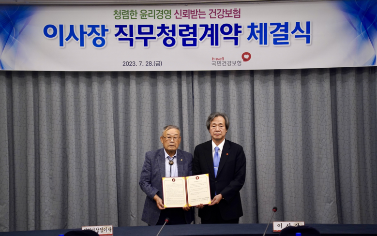 [세계타임즈 = 이현진 기자] 국민건강보험공단은 7월 28일 제7회 이사회를 개최하여 정기석 신임 이사장과 박용열 선임비상임이사 간 청렴하고 공정한 업무수행을 약속하는 직무청렴계약을 체결했다.