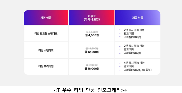 SKT가 이번에 선보이는 T 우주 티빙 구독 서비스는 광고형 스탠다드(4,500원), 스탠다드(1만2,500원), 프리미엄(1만6,000원) 등 세 가지 단품으로 구성된다. 이들 상품은 기존 티빙 상품보다 각각 1,000원씩 저렴한 가격에 이용할 수 있다.