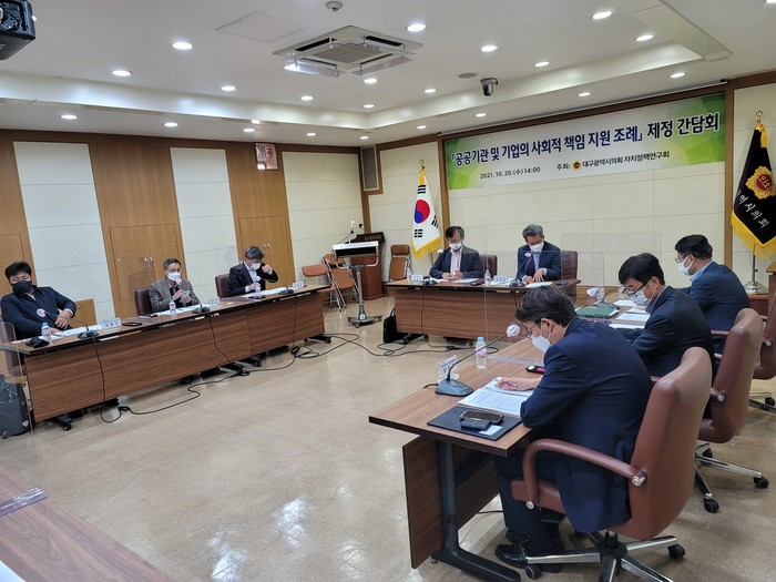 [대구=세계타임즈 한성국 기자] 대구광역시의회의 의원연구단체인 자치정책연구회는 20일(수) 오후 2시 공공기관 및 기업의 사회적 책임 활동을 제도적으로 지원하고자 관련 조례에 담을 사항을 논의하는 ‘조례 제정 간담회’를 시의회 3층 회의실에서 개최했다.