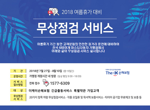 [세계타임즈 이영진 기자] 한국교직원공제회에서 100% 출자한 더케이손해보험은 하계 휴가철을 맞아 ‘차량 무상점검 이벤트’를 실시한다고 31일 밝혔다. 전국 1,111개 가맹점 중 무상점검 가능한 448여개 마스터자동차 가맹점을 통해 7월 27일부터 8월 10일까지 총 15일간 차량 무상점검 서비스를 제공한다고 밝혔다.