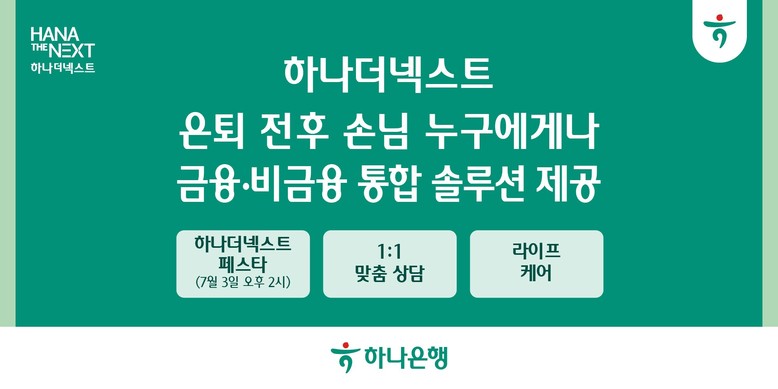 먼저, 하나은행은 다음달 3일 머니&라이프 세미나인 「2025 하나더넥스트 페스타」를 개최한다. 하나은행 을지로 본점에서 진행 예정인 이번 세미나는 ▲슬기로운 상속증여 노하우 ▲급여를 대체할 수 있는 연금활용 전략 ▲행복한 노후 만들기 강의 등을 주제로 진행되며, 하나은행 거래여부와 관계없이 관심 있는 손님들은 누구나 참여가 가능하다.