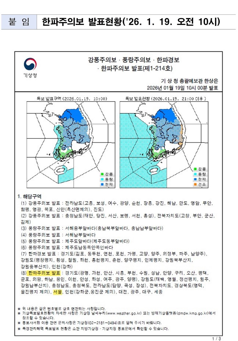 ‘한파주의보’는 아침 최저기온이 전날보다 10도 이상 하강해 3도 이하이면서 평년값보다 3도 이상 낮을 것으로 예상되거나, 아침 최저기온이 전날보다 12도 이하인 날이 2일 이상 지속될 것으로 예상될 때 발효된다.