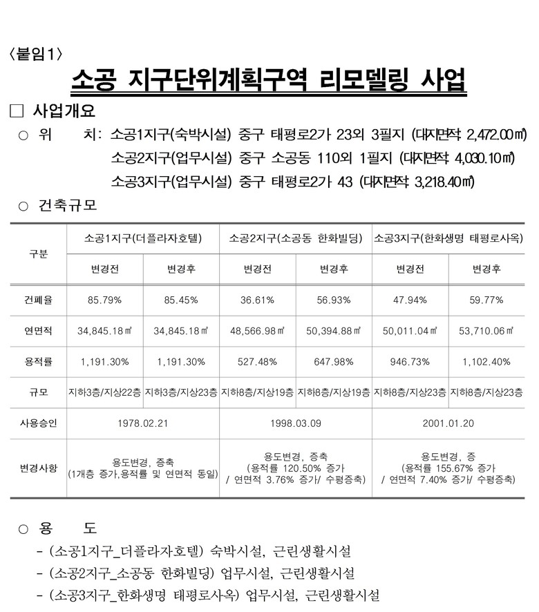 1978년 국내 최초 도심 재개발로 지어진 서울광장 인근 건물 3곳 ‘더플라자호텔’, ‘소공동 한화빌딩’, ‘한화생명 태평로사옥’이 47년 만에 철거 방식 대신 리모델링되며 혁신적인 도심활성화가 이뤄진다. ’20년 9월 지구단위계획 변경을 거쳐 심의를 통과했다.